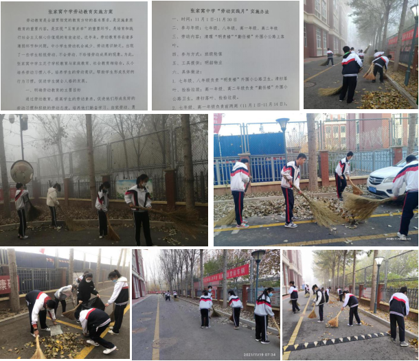 根据上级部门的相关文件,我校制定了《张家窝中学劳动教育实施方案》,在方案中明确了“劳动教育宣传周”和“劳动教育实践月”,即每学年五月份第三周为“劳动教育宣传周”,以“五一国际劳动节”为契机,在全校范围内进行广泛的宣传教育,每学年十一月份为“劳动教育实践月”,学生动手清扫环教学楼小公路的落叶。为此,学校德育处专门制定了《张家窝中学“劳动实践月”实施办法》来推动劳动教育实践活动。