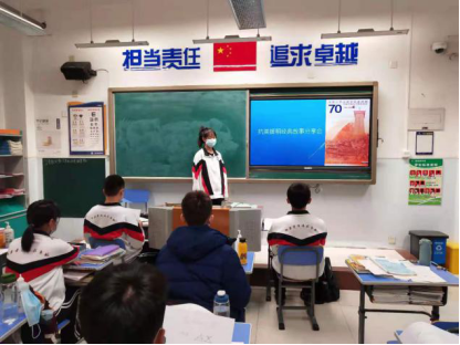 一、学校大屏播放“铭记历史 捍卫和平”宣传画面,营造氛围。